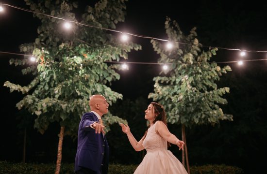 Their wedding made the most of the versatility of Casa Paço d’Ilhas. They exchanged vows beneath the canopy of trees, with the distant sound of the waves in the background. The reception featured long family-style tables surrounded by soft lights, creating an atmosphere that felt both intimate and festive.