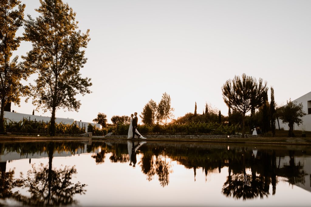Escolher um casamento no Land Vineyards é optar por um cenário muito particular no coração do Alentejo, onde a arquitetura contemporânea se integra naturalmente com a paisagem de vinhas e colinas. Localizado perto de Montemor-o-Novo e a cerca de uma hora de Lisboa, o espaço combina tranquilidade, natureza e uma atmosfera intimista que é difícil de encontrar noutros locais. O resort foi pensado como um retiro ligado à cultura do vinho, rodeado por vinhas orgânicas e com vistas para o castelo medieval da região, criando um ambiente muito especial para celebrar um casamento. Além disso, o espaço permite organizar cerimónias ao ar livre entre as vinhas e receber convidados que podem ficar alojados no próprio hotel, transformando o casamento numa experiência completa e relaxada durante vários dias.